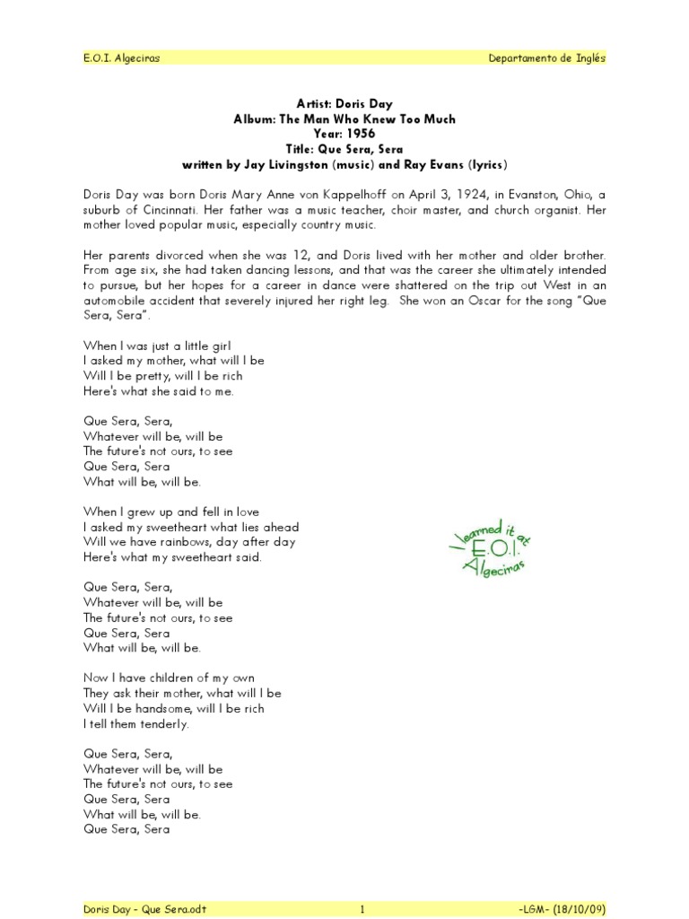 Que Sera Sera Whatever Will Be Will Be Lyrics And Music By Doris Day Arranged By Hsim Rogel