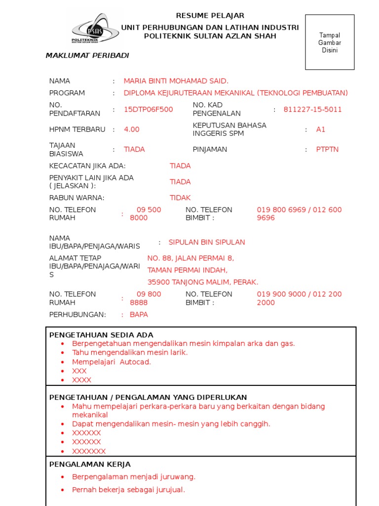 Resume Lengkap untuk Memohon Kerja (Pelajar Latihan Industri)
